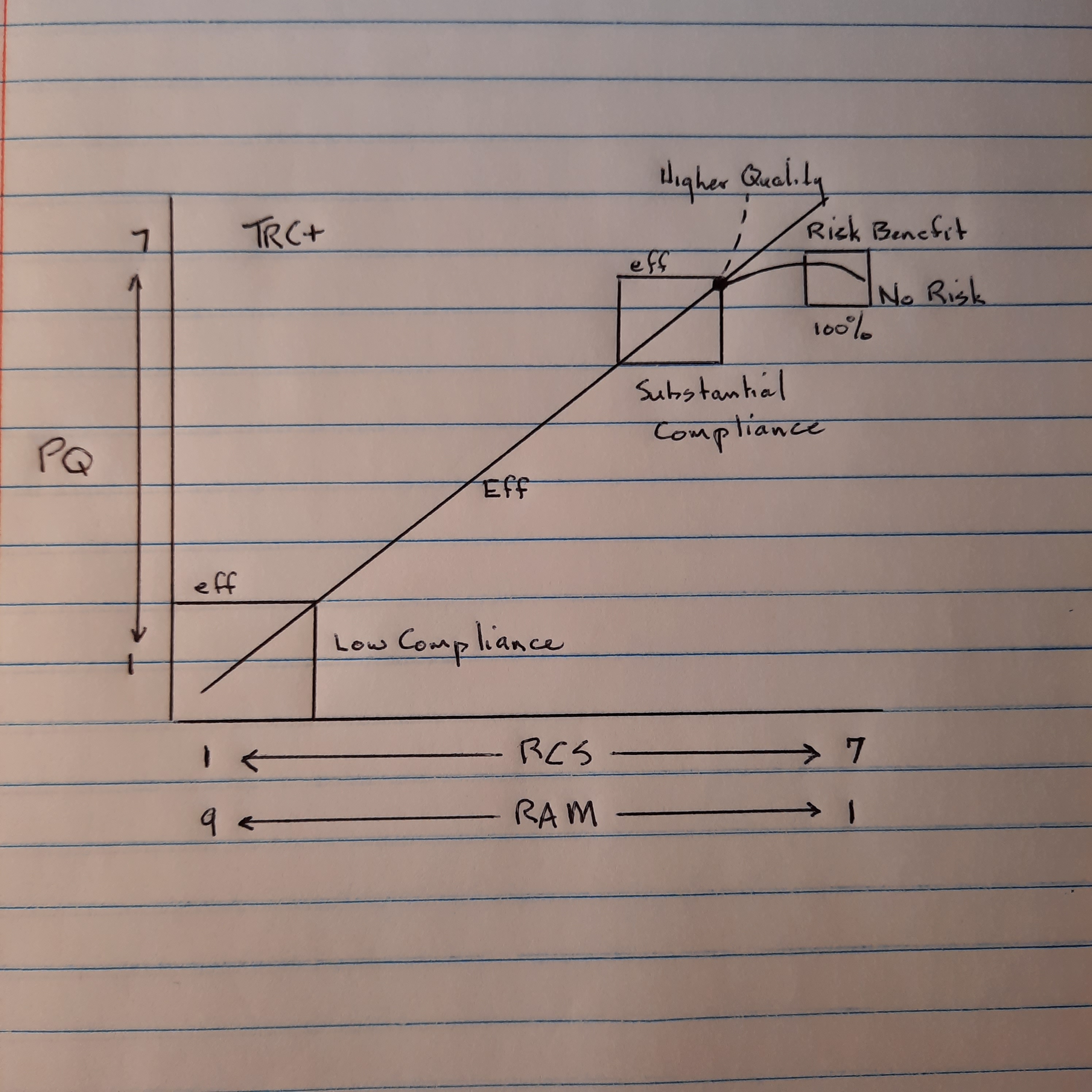 From the above graphic, this updates the original graphic on the RIKI Introduction Page. It places RAM and RCS in place of the regulatory compliance horizontal scale. The RCS scale is on a 7 point scale just as the PQ scale is. It also clearly demonstrates the differences between efficiency and effectiveness measures by depicting the RAM (Eff) and KIM (eff) metrics. And the essence of the theory demonstrates the curvilinear nature of the relationship between PQ and RC at the substantial compliance level. The trade offs in moving from substantial to full (100%) compliance with the benefit of no risk versus moving from substantial to higher quality benefiting the client but not reducing the risk.