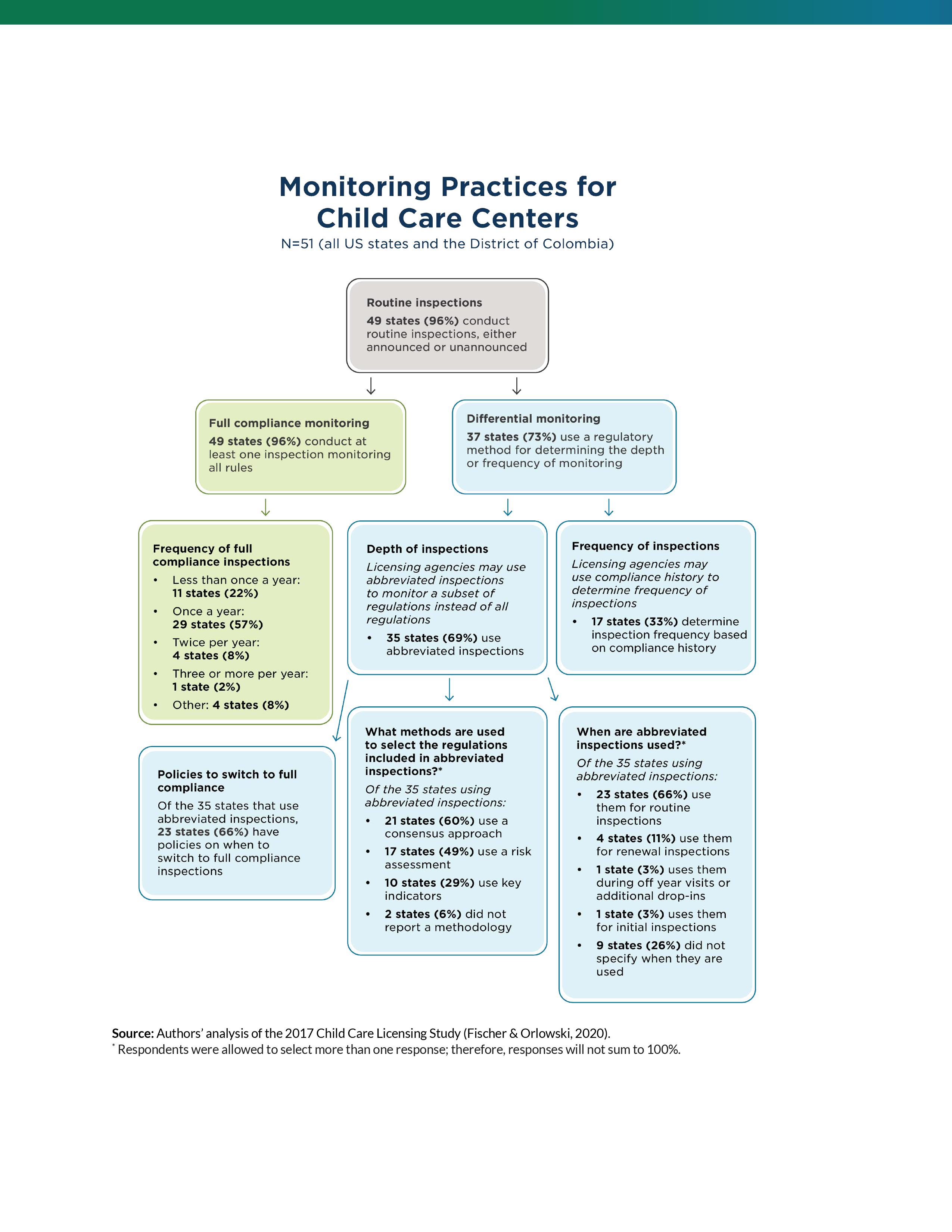 This first image provides a flow chart for depicting how monitoring practices are being conducted in the US as of 2020. The second image provides a map depicting how individual states are using abbreviated inspections/differential monitoring approaches, such as risk assessment, key indicators, and consensus building.